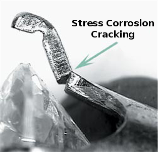 Technical- There is a chemical reation caused by the introduction of these harsh chemicals taking place at the microscopic grain boundries in the alloys that weakens the bonds between them thus allowing easy breakage of the metal. White gold is more readily damaged by these chemicals than is yellow golddue to the different alloys used in karating. Additionally, areas where the metal was stessed (prongs due to bending during setting) are affected more than unstressed areas.